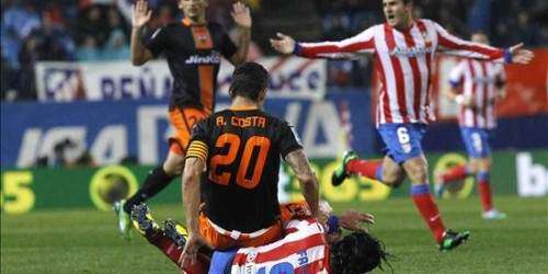 En ese periodo ya sí fue el conjunto rojiblanco que por momentos abruma en casa a sus rivales y que derriba por fuerza e intensidad a su adversario, hoy el Valencia, que se mantuvo en pie con tres paradas de Diego Alves a Diego Costa, Falcao y Diego Godín, cuando el Atlético le cercó en su área, en la que el árbitro Javier Estrada Fernández no vio un penalti por mano de Joao Pereira.