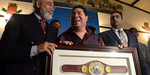 Wilfredo ‘Bazooka’ Gomez, ex triple campeón mundial y miembro del salón de la fama del boxeo internacional fue homenajeado por la Organización Mundial de Boxeo (OMB) hoy miercoles en el restaurante Zipperle de Hato Rey, como parte de la celebración del 37 aniversario de la adquisición de su primer cetro mundial.