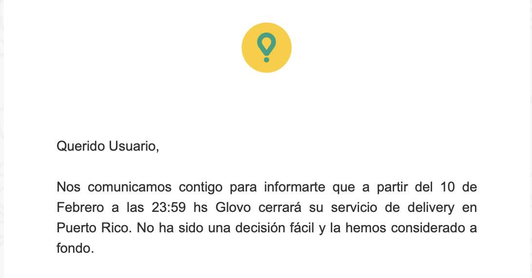 ‘No ha sido una decisión fácil y la hemos considerado a fondo… Gracias por pedir por Glovo, hemos disfrutado entregando ‘lo que sea’ en Puerto Rico y estamos agradecidos por la oportunidad que nos has brindado’, indica también la empresa.