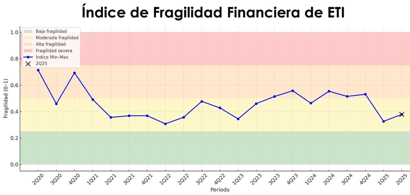“En el primer trimestre del 2025 el índice de fragilidad financiera se situó en 0.33, aumentando levemente a 0.38 en el segundo trimestre. A pesar de este repunte, el índice muestra una mejoría significativa frente al promedio de 2024, cuando se ubicaba en 0.52 y reflejaba un nivel de fragilidad alto”, informó Leslie Adames, director de la División de Análisis y Política Económica de Estudios Técnicos, Inc (ETI).