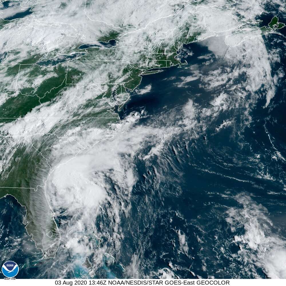 Los vientos máximos sostenidos de Isaías alcanzan ahora las 70 millas por hora (110 km) y el ojo de la tormenta se ubica a 100 millas (150 km) al este-sureste de Jacksonville (noreste de Florida) y a 250 millas (400 km) sur-suroeste de Myrtle Beach (Carolina del Sur).