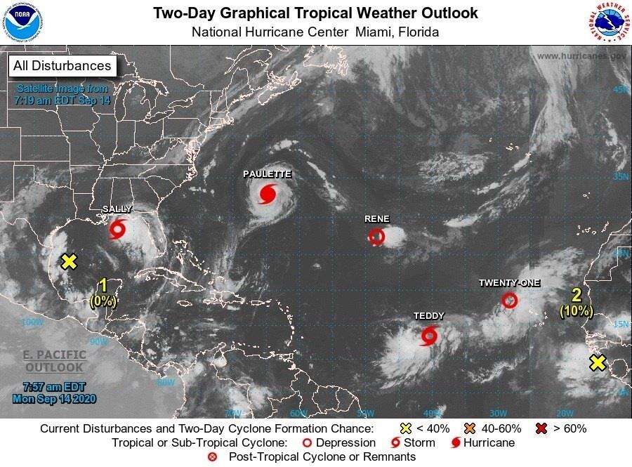La tormenta tropical Teddy y la depresión tropical 21 se sumaron este lunes a un panorama meteorológico en la cuenca atlántica cada vez más agitado, en el que también están el huracán Paulette, que impactó en Bermudas, la tormenta Sally, que amenaza a Luisiana, y la depresión tropical Rene.