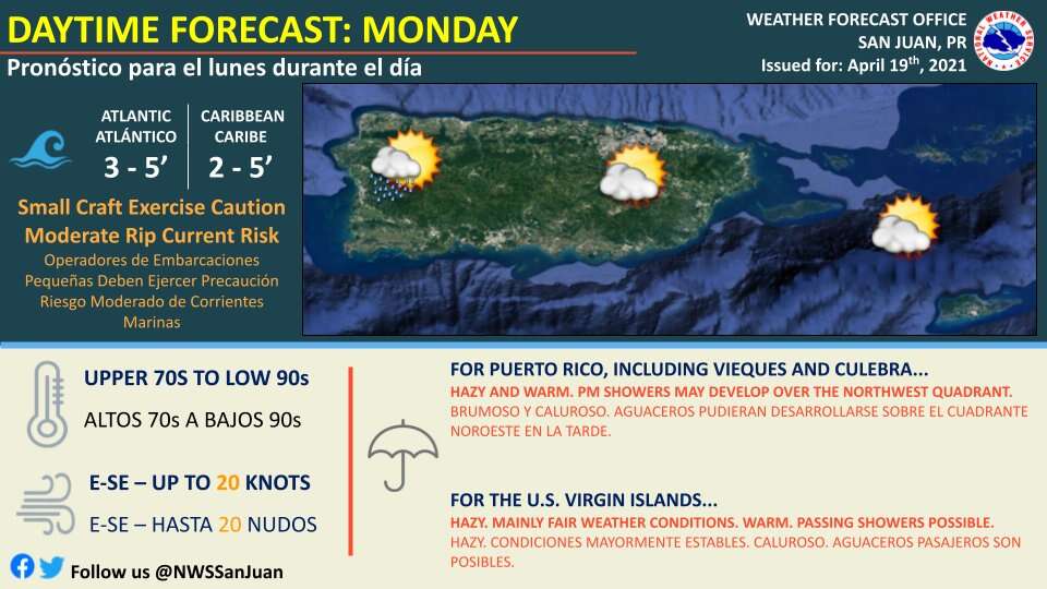Condiciones calurosas y brumosas se esperan para hoy, lunes, con algunos aguaceros sobre sectores del noroeste de Puerto Rico en la tarde, informó la oficina en San Juan del Servicio Nacional de Meteorología (SNM).