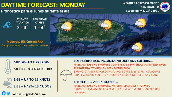 Para este lunes estará brumoso, con aguaceros pasajeros sobre el este de Puerto Rico en la mañana, mientras que en la tarde la lluvia será en el área metropolitana y el noroeste de la Isla, informó la oficina en San Juan del Servicio Nacional de Meteorología (SNM).