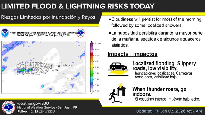 Las condiciones inestables continuarán hoy con aguaceros y tronadas aisladas en la tarde, sobre todo en el interior y suroeste de Puerto Rico.