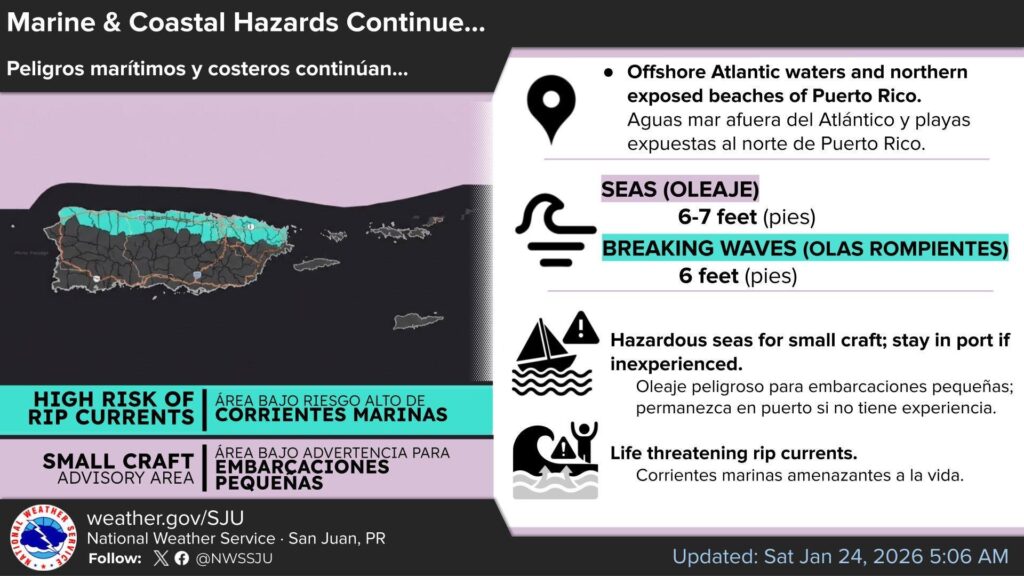 Las condiciones se mantendrán húmedas durante el sábado, con niveles de humedad más altos de lo normal que favorecerán lluvias pasajeras, sobre todo en la zona este, interior y oeste de Puerto Rico. Algunos sectores podrían acumular entre media pulgada y una pulgada de lluvia, lo que podría causar pequeñas inundaciones urbanas o crecidas menores de riachuelos en áreas propensas.