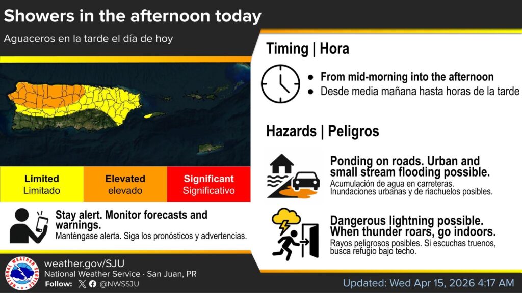 Para hoy, aguaceros dispersos antes del mediodía, luego más aguaceros entre el mediodía y las 3:00 pm, y lluvia más frecuente después. Temperatura máxima cerca de 86°F. Viento leve del sureste, cambiando a este-sureste de 5 a 10 mph. Probabilidad de lluvia 80%. Acumulaciones entre media y tres cuartos de pulgada.