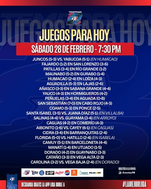 En el Sur, Juana Díaz consolidó el liderato al vencer 5-2 a Ponce en 11 entradas con tres carreras en el undécimo episodio. Jorge Benítez ponchó 14 en nueve entradas sin decisión. Coamo superó 8-7 a Salinas y Santa Isabel dejó en el terreno 5-4 a Guayama en la décima con hit de oro de Carlos Alfonso.