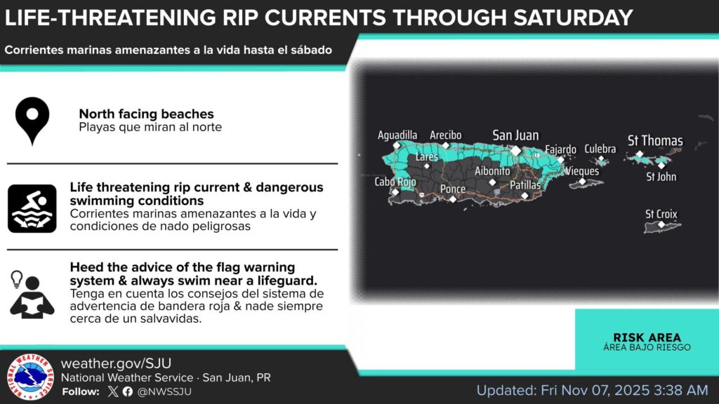 El Servicio Nacional de Meteorología (SNM) advirtió que las condiciones marítimas continúan peligrosas hoy a lo largo de las costas del Atlántico debido a un oleaje del norte, lo que genera un alto riesgo de corrientes marinas, especialmente en las playas de San Juan, Arecibo y Aguadilla.