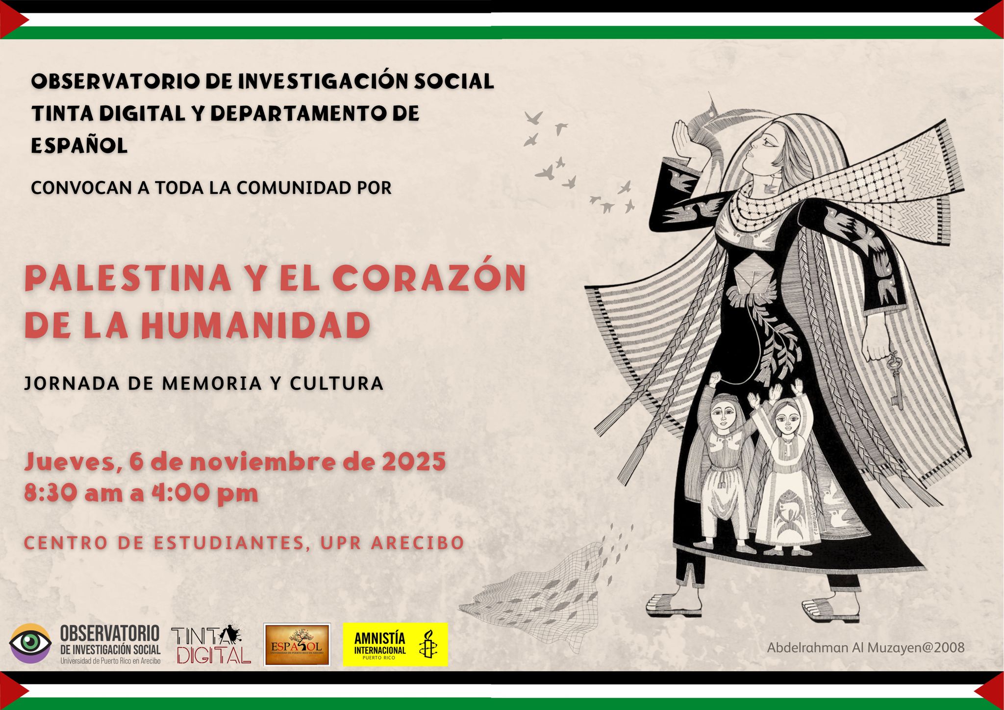El Observatorio de Investigación Social de la Universidad de Puerto Rico en Arecibo (UPRA), comenzará el jueves el proyecto educativo bautizado: «Jornada de Memoria, Cultura Palestina y el Corazón de la Humanidad», que servirá como acto de concienciación ante la situación crítica que vive hoy el gobierno palestino.