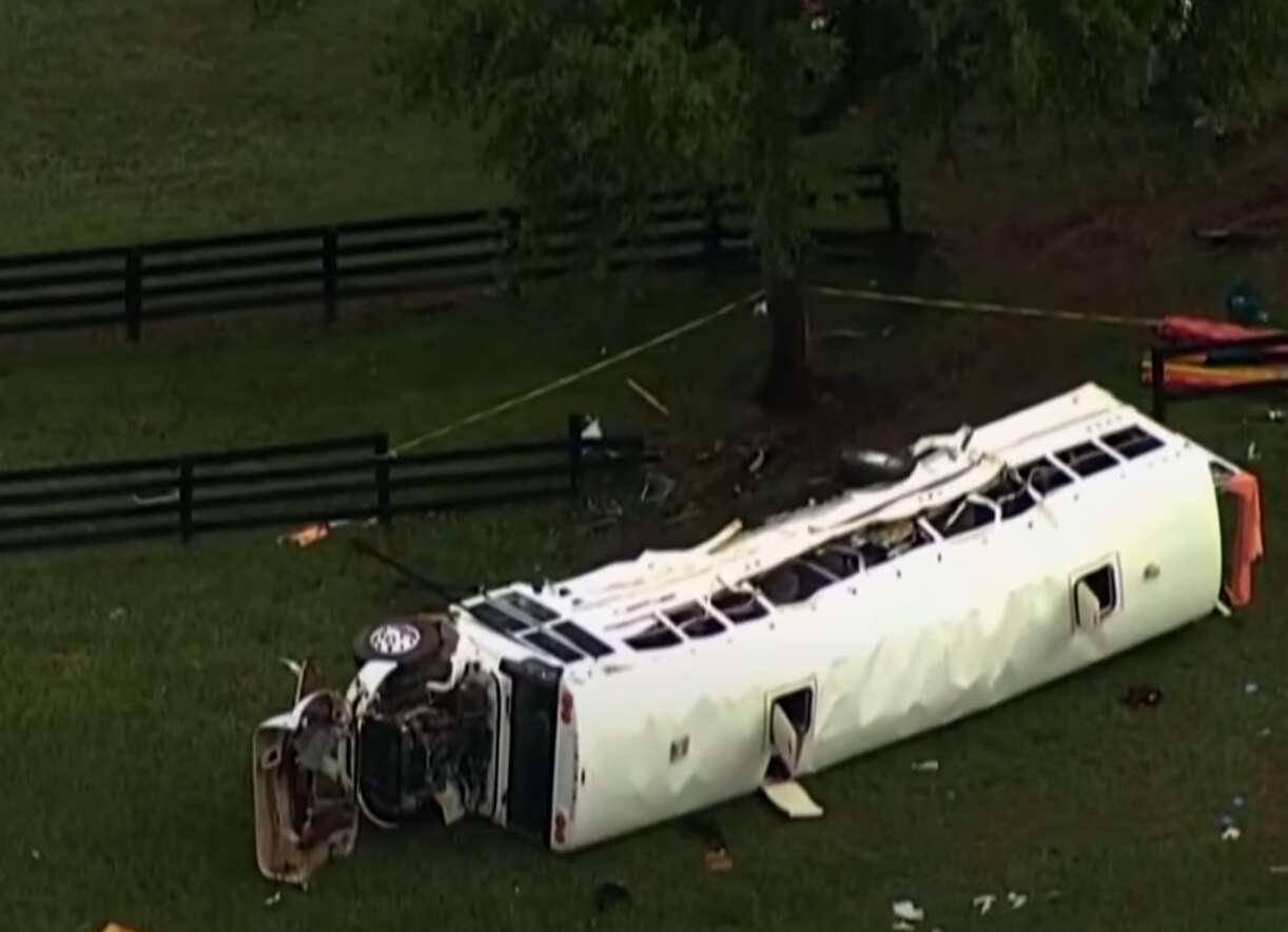 Imágenes del canal Fox muestran el autobús volcado al lado de una cerca de madera y árboles, con considerables daños en su chasis.