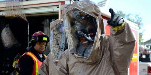 Poco a poco iban saliendo los heridos, actores maquillados para aparentar heridas de todo tipo. ‘Dónde está Carla? Carla! Alguien salve a Carla!’, clamaba entre sollozos una de las víctimas, mientras forcejeaba con un militar vestido con un traje Haz-Mat (traje resistente a químicos) que lo escoltaba a la estación de limpieza.