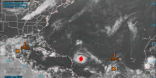 A las 11:00 pm el centro del huracán Irma fue localizado en la latitud 16.7 norte, longitud 55.6 oeste. Irma se mueve hacia el oeste a 13 millas por hora (20 km/h) y su movimiento de traslación se espera que continúe hasta el martes, seguido por un giro hacia el oeste noroeste tarde el martes.