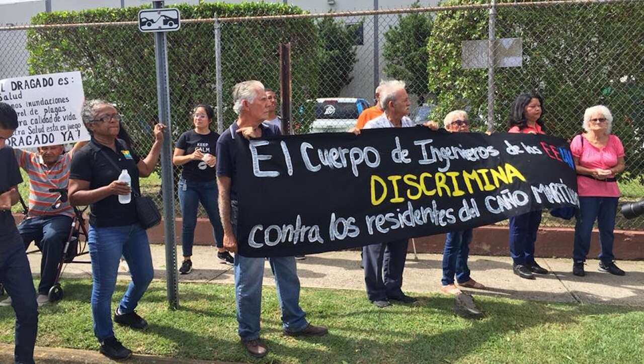Un grupo de residentes de las comunidades del Caño Martín Peña, encabezados por líderes del G-8, se manifestaron frente a las oficinas del Cuerpo de Ingenieros para repudiar que en dos oportunidades se negaran los fondos para construir el dragado del Caño, prolongando los problemas de salud pública e inundaciones con aguas usadas.