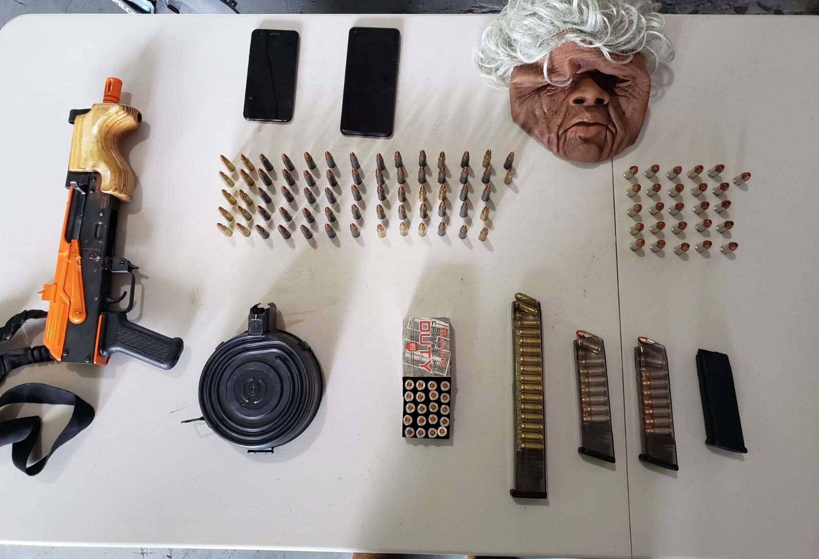 En medio del arresto se ocupó el vehículo de motor marca Kia, modelo Rio, color blanco, donde se ocupó un arma de fuego (AK 47), con un cargador tipo tambor con 67 municiones calibre 223, tres cargadores adicionales con un total de 86 municiones calibre 45, además de una máscara.