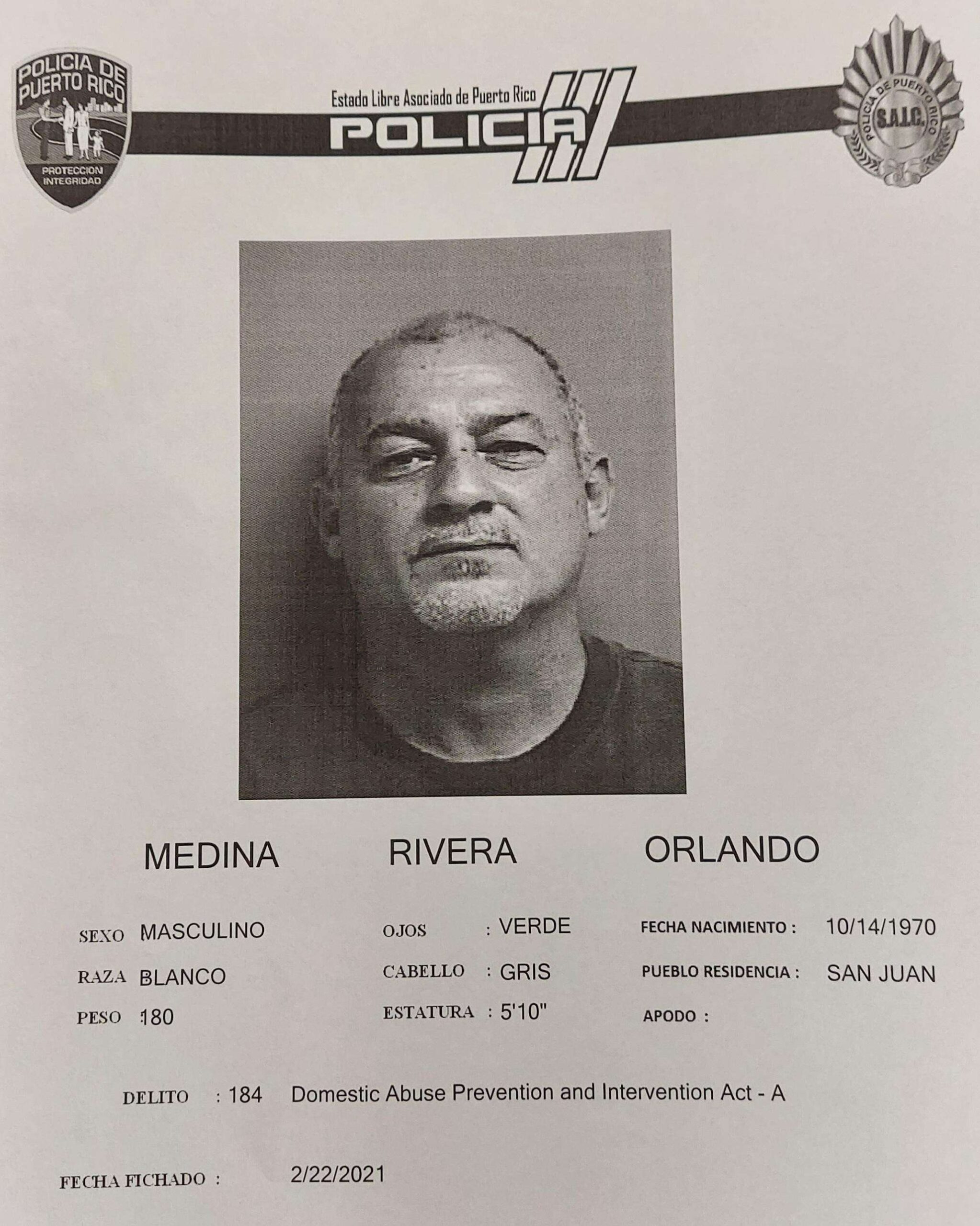 Contra Medina Rivera pesaba una orden de arresto, con fianza de $50,000 mil dólares, expedida por la juez Ingrid Alvarado del Tribunal de Caguas por el artículo 3.1 (Maltrato) de la Ley 54.