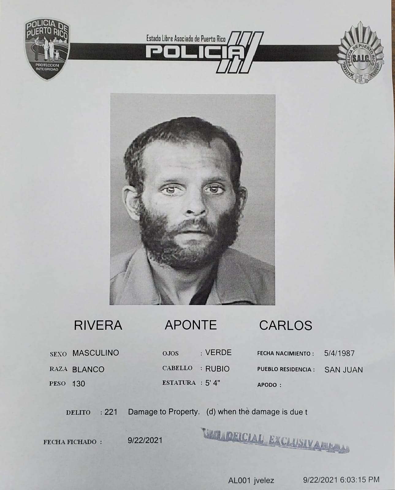 Según la Uniformada, supuestamente el pasado 18 de septiembre, Carlos Rivera Aponte, de 34 años, utilizó una tijera con la que le causó daños en la parte lateral posterior y el baúl de una patrulla que se encontraba estacionada en el Cuartel de Santurce. Agentes lo pusieron bajo arresto.