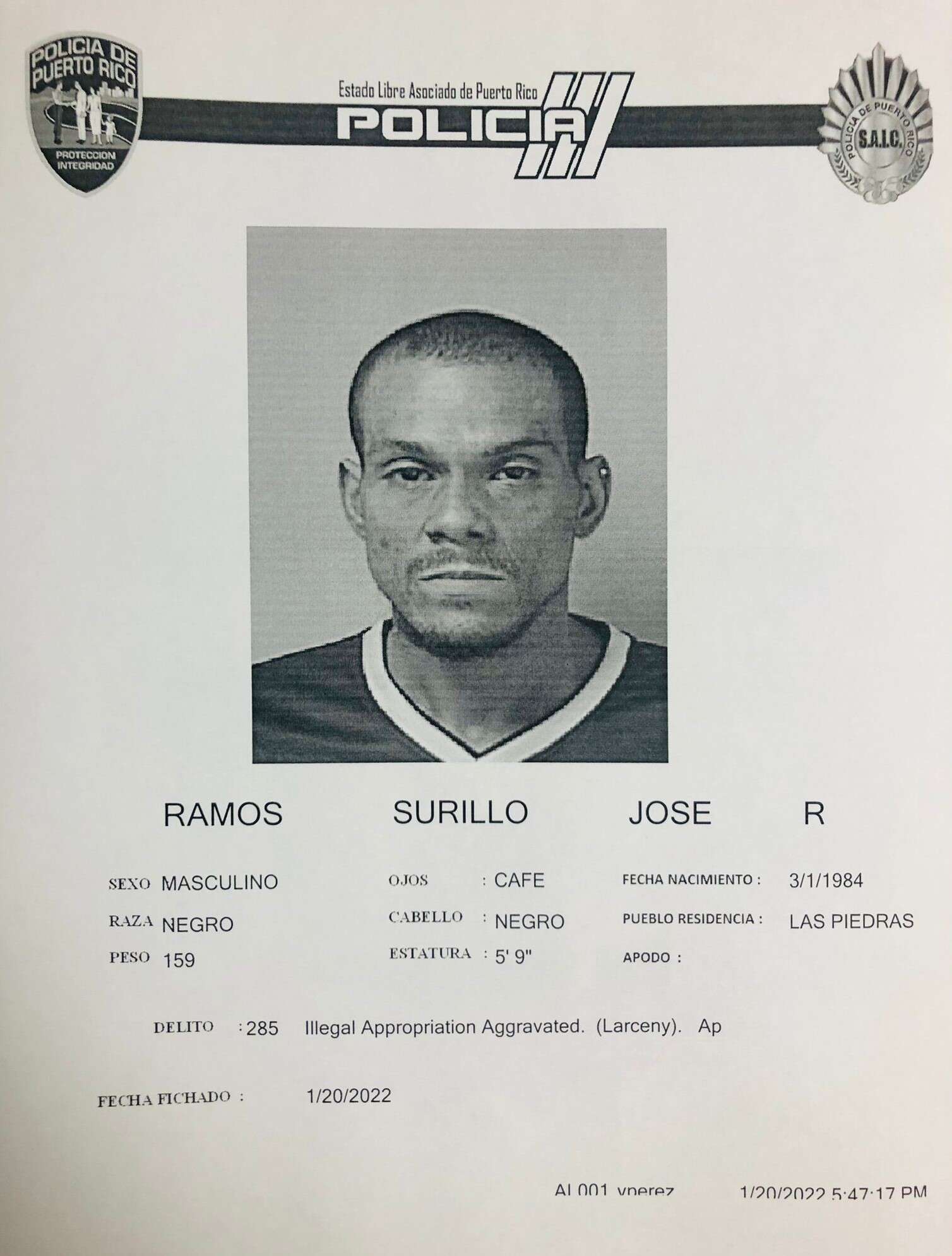 Ramos Surillo posee expediente criminal por delitos similares, sustancias y Ley 8 (Ley para la Protección Vehicular). También es sospechoso de múltiples escalamientos ocurridos en nuestra zona recientemente y en los pasados años.