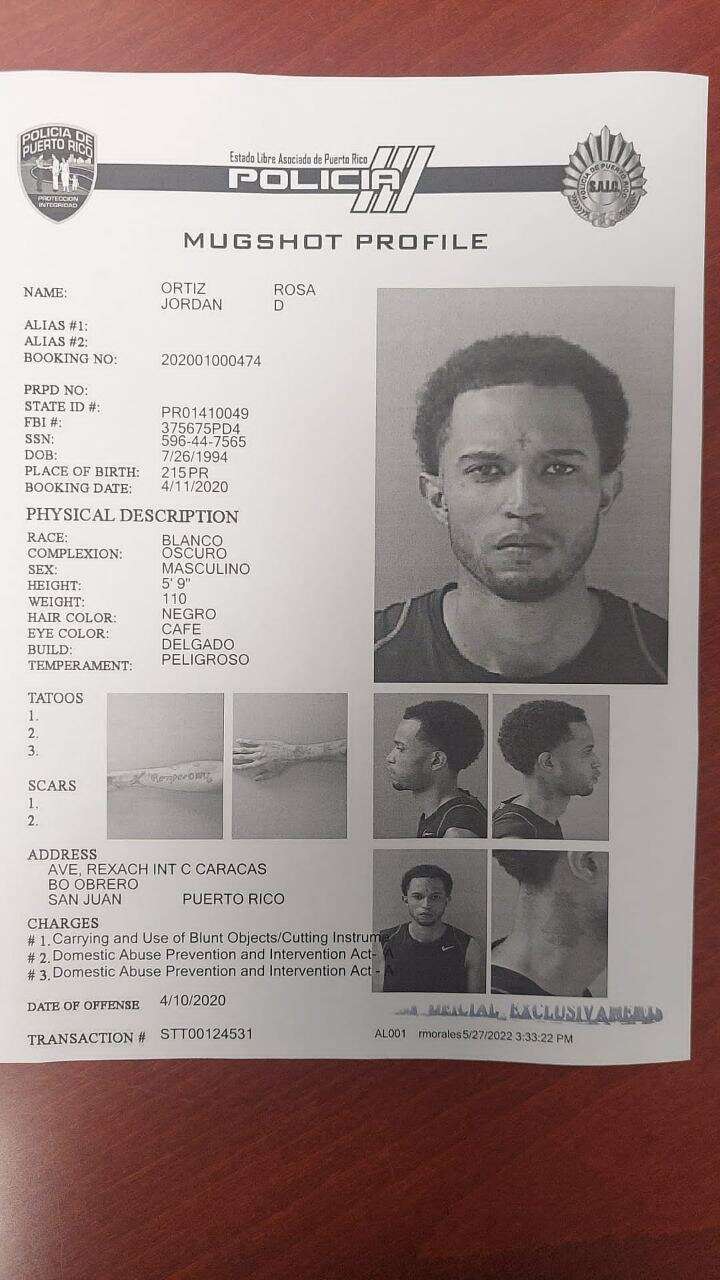 Conocido en el bajo mundo como Jordan, el individuo se considera “sumamente violento” y se presume es un “gatillero.” Su expediente criminal lo identifica como de Barrio Obrero en San Juan, con tatuajes que lo identifican como miembro de “la Rompe ONU” y como un sujeto sumamente violento.