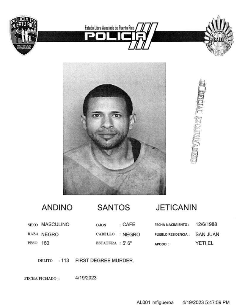 Agentes del Negociado de la Policía de Puerto Rico, adscritos a la División de Homicidios del CIC de San Juan, realizaron una investigación que culminó en la radicación de cargos por Asesinato en Primer Grado (Artículo 93 del Código Penal), Riesgo a la seguridad u orden público al disparar un arma de fuego (Artículo 249 del Código Penal) y Disparar o Apuntar Armas de Fuego (Artículo 6.14 de la Ley de Armas), por parte de Fiscalía, contra Jatticanin Andino Santos, de 35 años y vecino de San Juan.