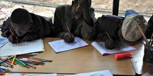 Tras desayunar en el comedor de los Padres Misioneros de la Caridad, que cede sus instalaciones para las clases, una veintena de chicos, muchos de ellos descalzos y con la ropa marrón de polvo y suciedad, se abalanzan sobre los rotuladores.
