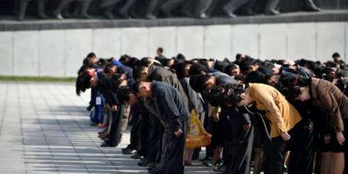 Desde primera hora de la mañana, hordas de ciudadanos hacían cola en la colina Masun, en el centro de Pyongyang, para depositar flores y hacer una reverencia solemne ante las estatuas de Kim Il-sung y la de su hijo y sucesor Kim Jong-il.