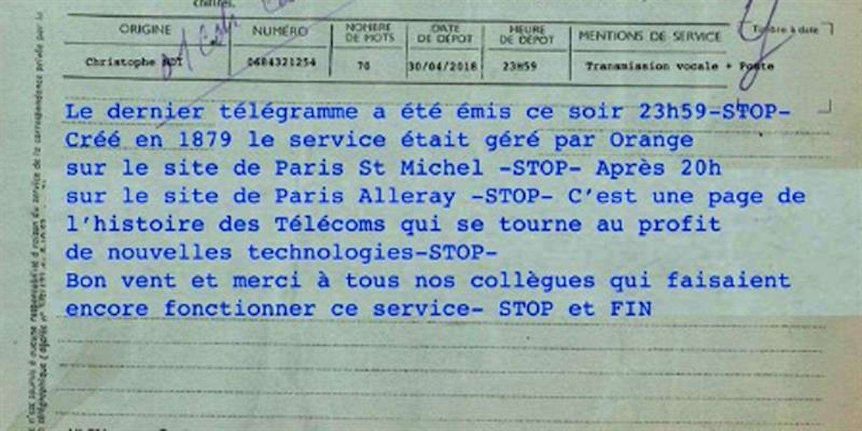 El último telegrama de Francia fue enviado este lunes por la noche, según informó hoy el operador de telecomunicaciones Orange, encargada de este servicio que existía en Francia desde 1879.