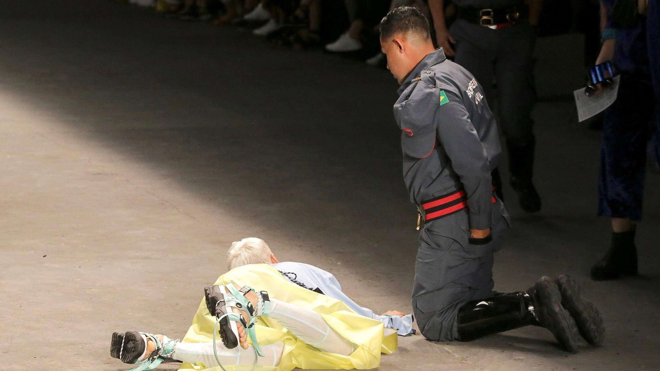 ‘Acaba de morir una persona y estáis aquí como si la vida no valiese nada’, gritó un artista vestido de dorado desde la pasarela durante el desfile de clausura en la noche de este sábado de la 47 edición de la Semana de la Moda de Sao Paulo, el mayor evento del sector de la moda en Brasil.