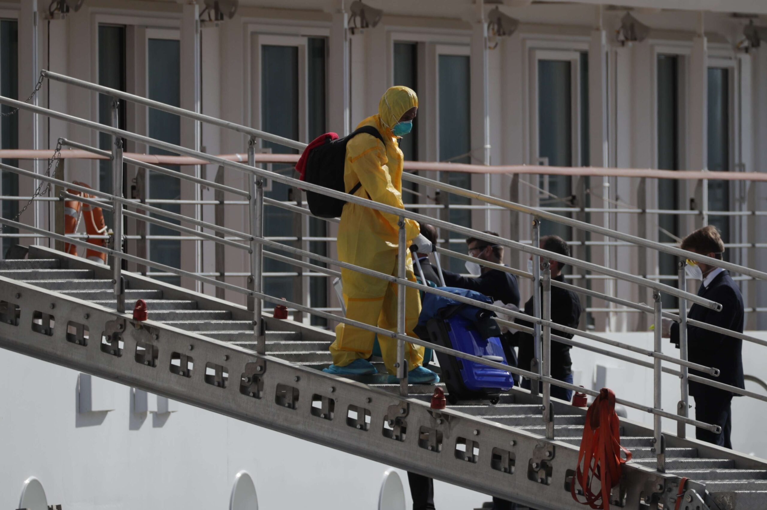Todos ellos abandonaron la nave con trajes de protección especial y su respectivo equipaje, pasando por una exhaustiva desinfección previa al abordaje de los autobuses.