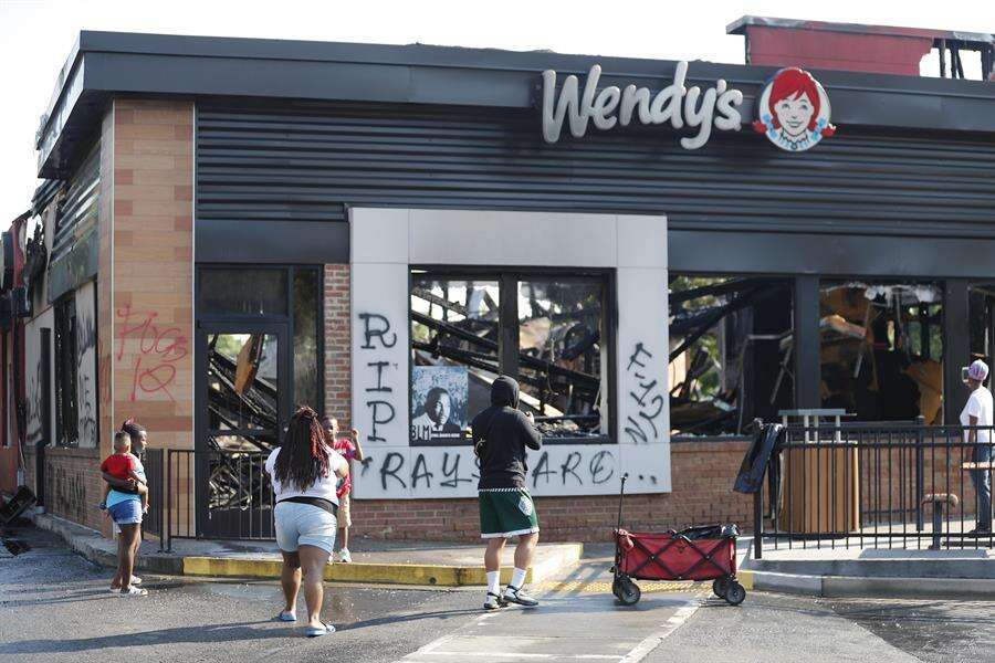 Manifestantes y curiosos se acercaron la mañana del domingo al Wendy’s, que quedó chamuscado y con apenas las paredes exteriores en pie, informó la cadena local WSB.