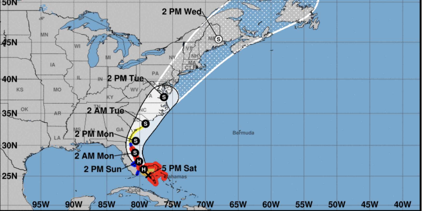 Isaías volverá ser un huracán esta noche y seguirá así hasta el lunes y martes, cuyo centro se moverá desde la costa de Georgia hacia el sur de los estados del Atlántico medio, indicó el NHC.