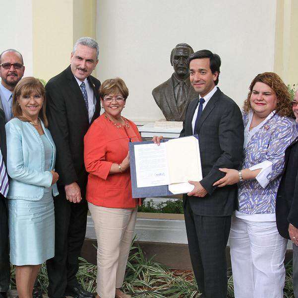 Frente a una estatua del exgobernador Luis A. Ferré en Ponce, junto a los presidentes de Cámara y Senado, Jennifer González y Thomas Rivera Schatz, y la alcaldesa de Ponce, María Mayita Meléndez, Luis Fortuño convirtió en ley el proyecto que viabiliza una consulta de status que se celebrará el 6 de noviembre de 2012, día de las elecciones.