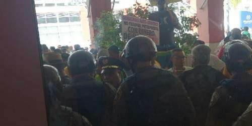 Inmediatamente se desarrolló un forcejeo entre unionados y policías, quienes precariamente podían impedir el acceso de los manifestantes.