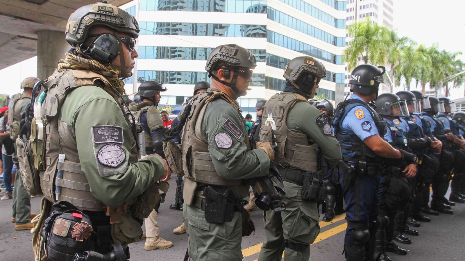A las 12:23 de la tarde, decenas de agentes de la División de Operaciones Tácticas (la Fuerza de Choque) bajaron por la avenida Chardón hasta la avenida Muñoz Rivera y establecieron una línea que empezó a marchar en dirección de la tarima. De inmediato líderes sindicales cuestionaron la presencia de ellos tan cerca de la tarima, tomando en cuenta que durante el fin de semana habían entablado un acuerdo con la entonces Superintendente de la Policía, Michelle Hernández, para que ellos no estuviesen visibles en el área de protesta.