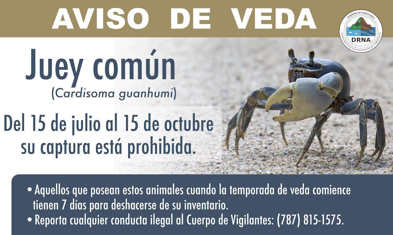 El Departamento de Recursos Naturales y Ambientales (DRNA) informó este viernes el comienzo de la veda del juey común a partir del domingo, 15 de julio, termino que se extenderá hasta el 15 de octubre del año en curso.