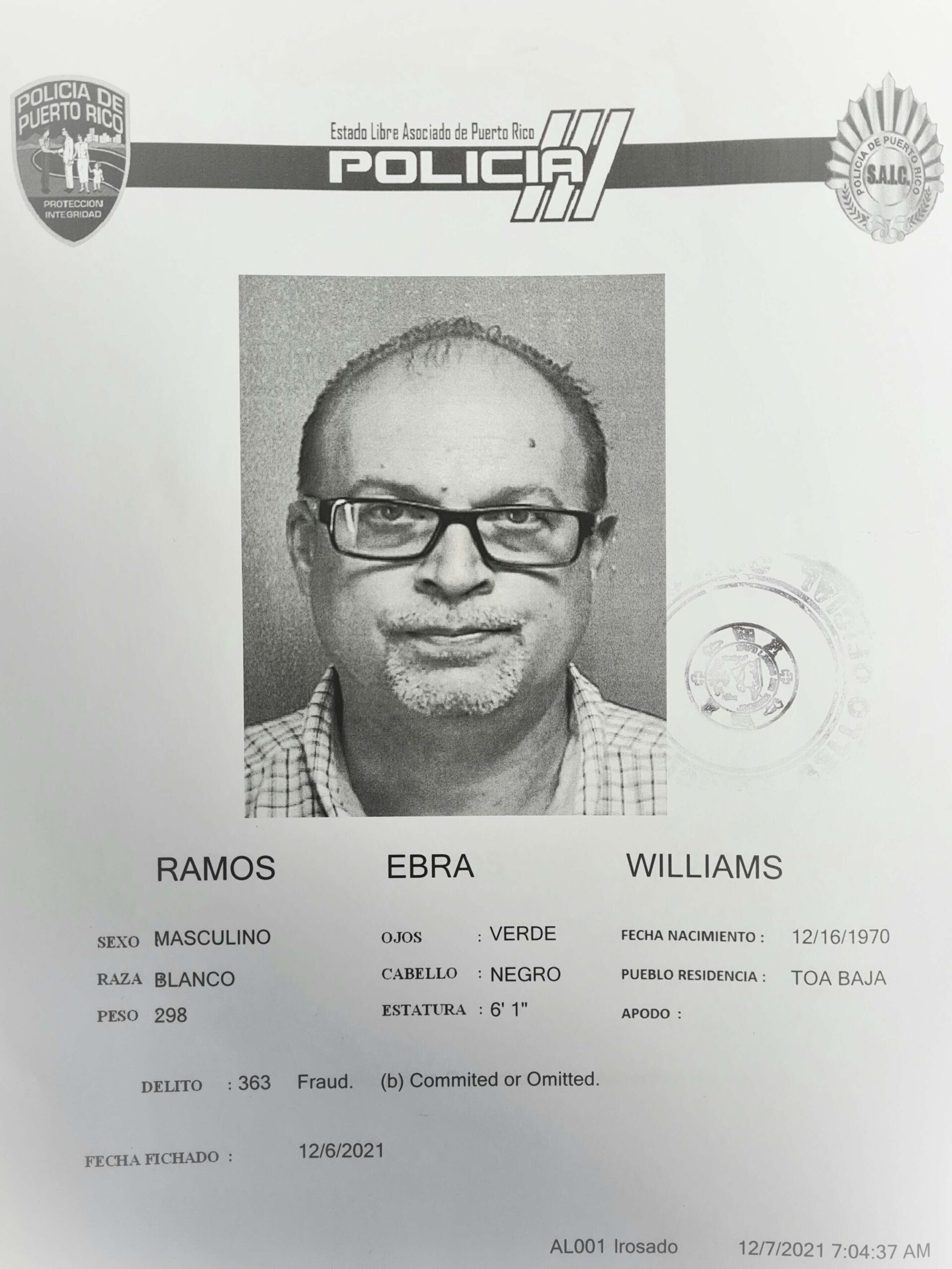 Los cargos fueros presentados ayer contra William Ramos Ebra, de 50 años, residente en Toa Baja, por apropiaciones ilegales (art. 182 grave 18 cargos) y fraude (art. 202,18 cargos). Los hechos ocurrieron desde el año 2016 hasta el año 2020 cuando laboraba en una tienda de piezas para vehículos en Bayamón.