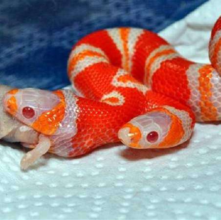La organización Sunshine Serpents informó hoy de que, como suele suceder en la mayor parte de los ofidios, este raro ejemplar de serpiente albina de dos cabezas comió por fin su primera comida después de haber cambiado por primera vez su piel.