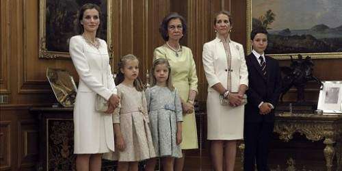 Los tonos claros han sido los elegidos también por la Reina Sofía, que ha optado por un vestido en tono lima y un collar de perlas, mientras que la infanta Elena ha elegido un traje de chaqueta en blanco roto y rosa palo.