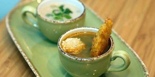 Otras delicias del ‘power lunch’ son la crema de malanga con ensaladita de bacalao y aguacate, filete de dorado con tostones, filete de res encebollado con arroz mamposteao, costillas glaseadas en soya dulce, pechuga de pollo rellena de espinacas y queso, con majado de malanga.