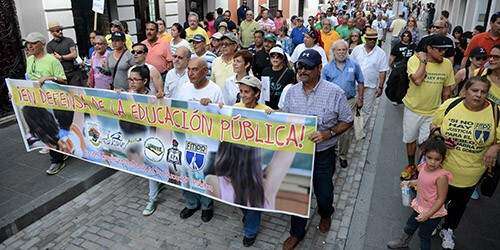 ‘Nuestros estudiantes son seres humanos, no mercancía’. Con dicha consigna el Frente Amplio en Defensa de la Educación Pública (FADEP) marchó hoy domingo hasta los portones de La Fortaleza, para advertirle al Ejecutivo que ‘no van a tolerar el establecimiento de medidas que deterioren el servicio educativo’, como la recomendación de cerrar 580 escuelas y eliminar sobre 10 mil plazas de maestros.