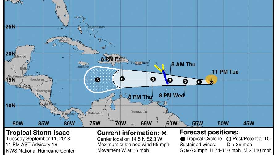 A las 11:00 de esta noche la tormenta tropical Isaac mantenía su movimiento hacia el oeste a unas 16 millas por hora y se espera que mantenga ese movimiento por los próximos días.