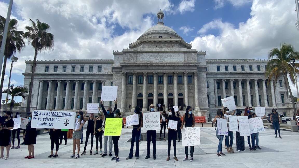 Luego de hacer una caravana, más de una veintena de personas se congregaron frente a la llamada “Casa de las Leyes” con pancartas alusivas a la oposición al Proyecto del Senado (PS) 1590, que permitirá que cualquier persona que está cumpliendo una pena de reclusión a consecuencia de un veredicto que no fue unánime, pueda presentar moción para que se celebre un nuevo juicio.