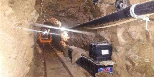 El túnel cuenta ‘con vigas metálicas para evitar su derrumbe, un sistema de iluminación y ventilación a base de baterías de automóvil y un mecanismo de rieles para mover una plataforma con la carga’.